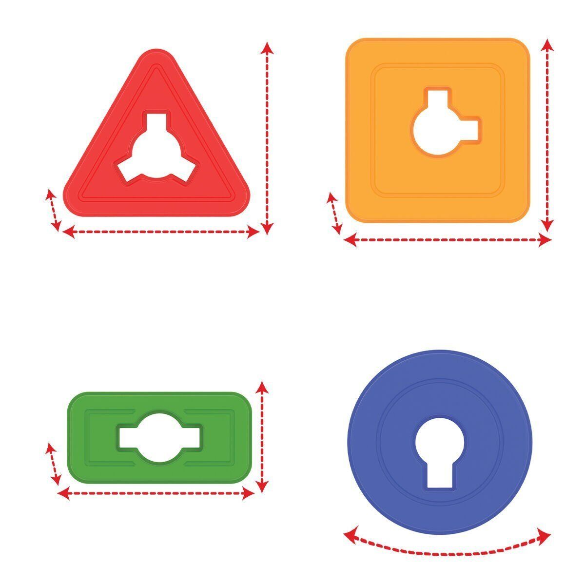 Daire, kare, üçgen ve dikdörtgen şekilli geometrik parçalar mevcuttur. Oyuncak; parçaya göre uygun konumun bulunarak, çıkıntılı çubuklardan geçirilmesini ve tablaya oturtulmasını amaçlar.
