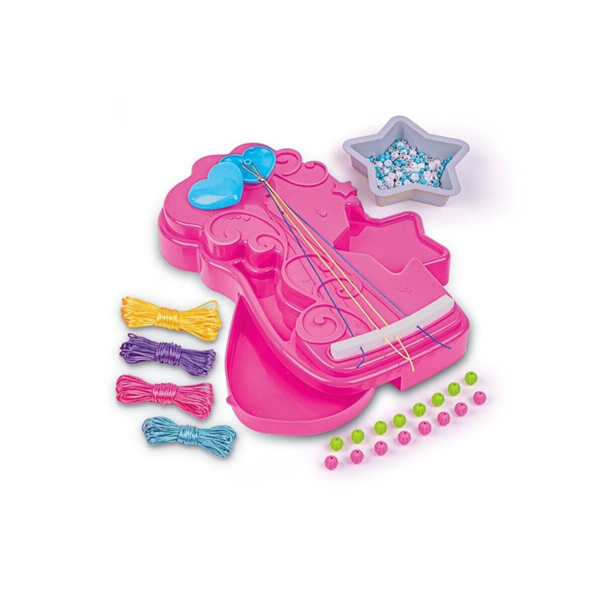 Kit, birçok kreasyon yaratabileceğiniz bir çerçeve, birçok renkli boncuk ve süper göz alıcı kordonlar içerir.
