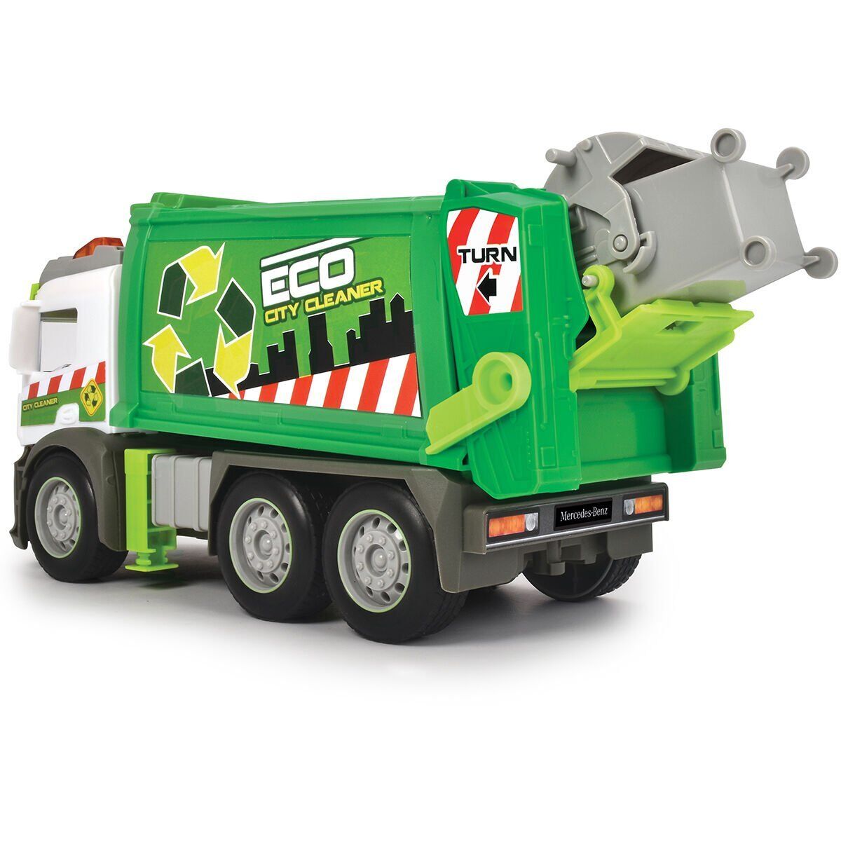 Araç ayrıca, yapı taşları ve küçük nesnelerle doldurulabilen bir tekerlekli çöp kutusu ile birlikte gelir. Çöp kutusu dolduğunda, araçtaki destek sütunlarını açın ve çöp kutusunu yerine yerleştirin. Daha sonra yerleşik kol, çöp kutusunun içindekileri araca boşaltmak için kullanılabilir. Ayrıca, römorku bir çöp sahasında boşaltmak için bir eğme işlevi de vardır. Mercedes kamyonundan modellenmiştir Kamyon, bir Mercedes Actros'tan modellenmiştir ve büyük bir Mercedes logosuna sahiptir.