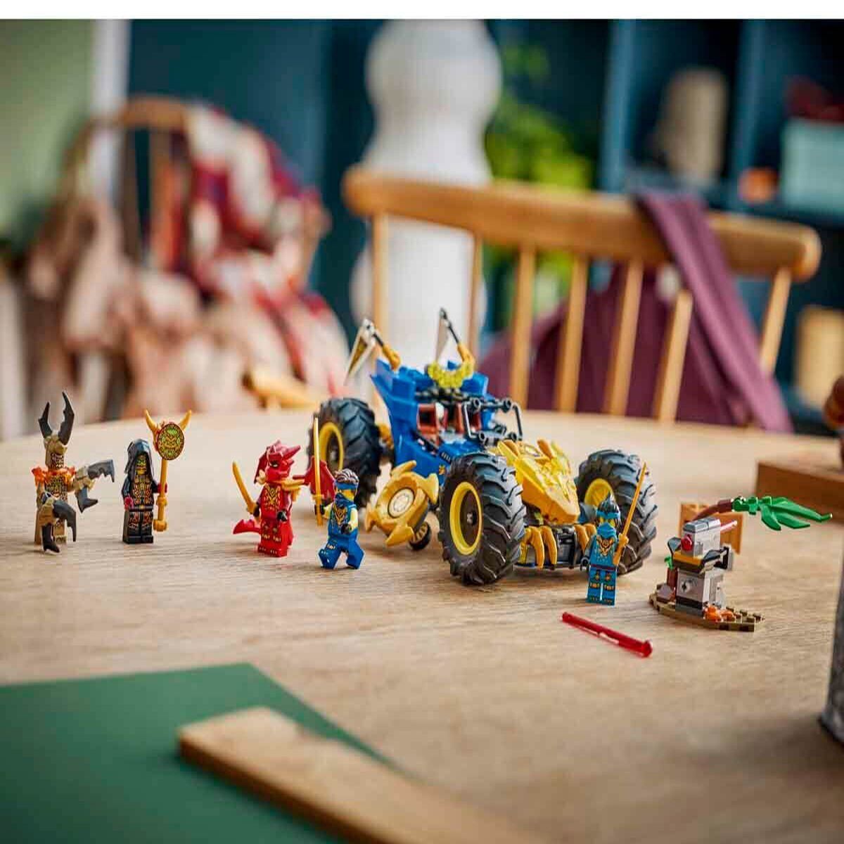8 yaş ve üzeri erkek ve kız çocuklar, LEGO NINJAGO Jay'in Dönüşen Arabası (71856) oyuncak yapım setiyle saatlerce hızlı aksiyonun keyfini çıkarabilirler. Bu 2'si 1 arada ninja araba yarışı oyuncağıyla 2 farklı şekilde oynayabilir ve sergileyebilirsiniz. Normal modda oynayın veya ön kısmını çevirip ejderha moduna geçerek altın pençeleri, ejderha başını ve dönen ninja yıldızlarını ortaya çıkarın. Bu uygun fiyatlı çocuk macera oyuncağında bulunan 2 dartlı yaylı atıcıyı çocuklar ayırabilir ve bitkilerle kaplı yan modele yerleştirerek savaş oyunları oynayabilir. Sette ayrıca 5 LEGO NINJAGO mini figürü bulunur. Jay, Nya ve ejderha formundaki Kai, ayrıca kötü Toprak Canavarı ve Sadık Lider arasında iyiyle kötünün savaşını canlandırabilirsiniz.