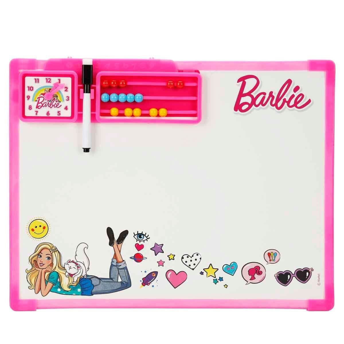Üstelik yazı tahtasının ön yüzünde bulunan abaküs sayıları öğretirken, saat ise çocuklara zamanı öğretecektir. Arka yüzünde bulunan geometrik şekiller, çarpım tablosu, küçük ve büyük harfler ile çocukların eğlenerek öğrenmesine yardımcı olur. Barbie ile ders zamanı!
