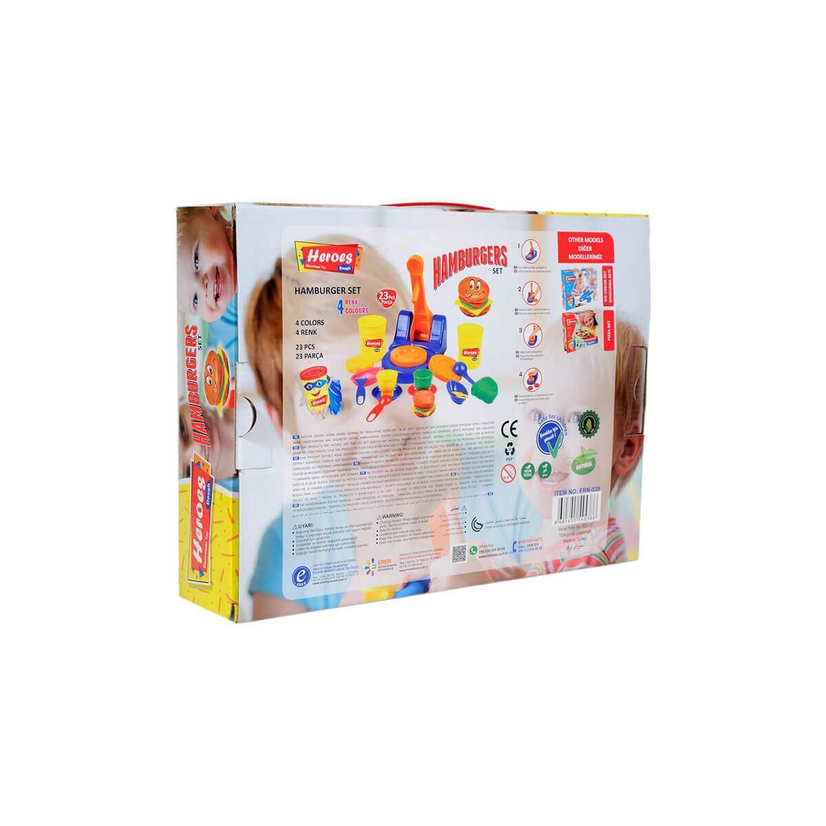 • Set İçeriği: 1 adet hamburger makinesi, Şekiller oluşturmaya yardımcı çeşitli aksesuarlar, 4 farklı renkte oyun hamuru bulunmaktadır.