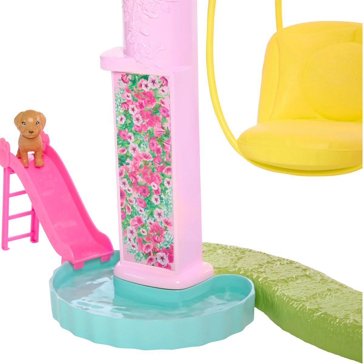 Barbie® bebek ve arkadaşlarının kaydıraktan havuza girmesini izleyin! (Bebekler dahil değildir.) Bu oyuncak bebek evi, gerçek bir evcil hayvan sarayı görevi görür ve hatta bir köpek yavrusu figürü içerir!