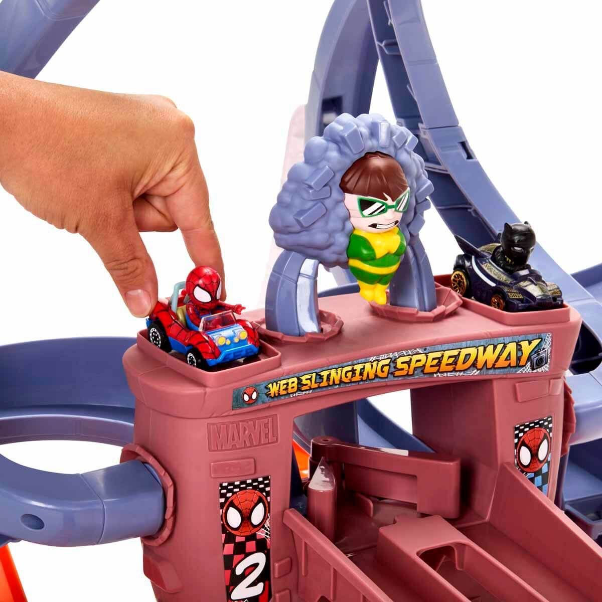 Çocuklar, dahil olan Hot Wheels RacerVerse die cast Spider-Man ve Black Panther araçlarını bir döngüden ve virajlardan beş kez hızla fırlatır. Birincilik zaferi garantilerken, ikincilik köprü çöktüğünde Doc Ock'un pençeleri tarafından pistten düşürülür!