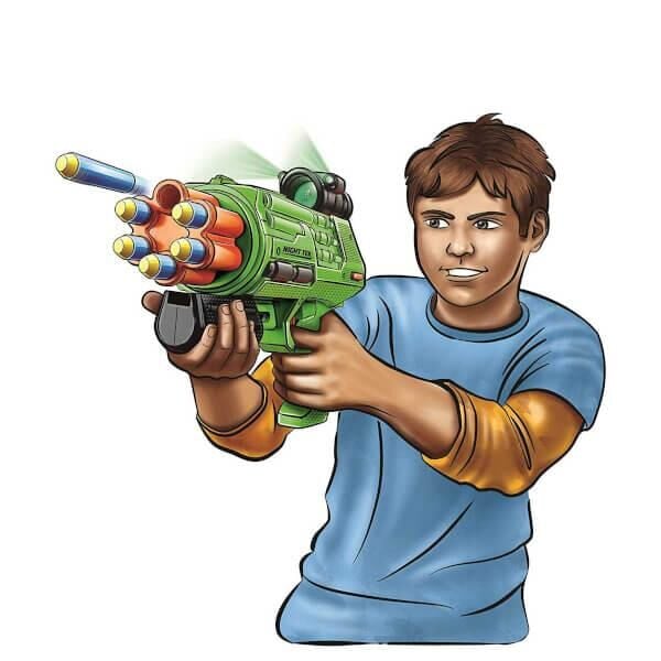 29 cm. uzunluğundaki silahın; unuz menzil, güçlü atış ve kaliteli tasarım özellikleri bulunmaktadır. Dartları yerleştirin kolu ittirin ve oyuna başlayın! Silahın üzerinde bulunan ışıklı dürbün ile çocuklar gece de silahlarını kullanabilecekler.