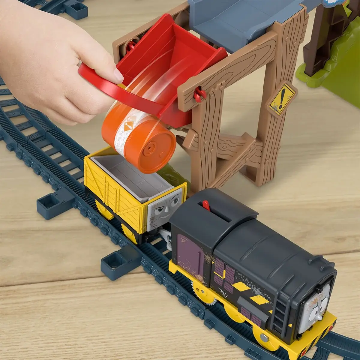 Çocuklar için Thomas ve Arkadaşları Diesel ve Troublesome Truck karakterlerini içeren şantiye temalı ve motorlu oyuncak tren seti.