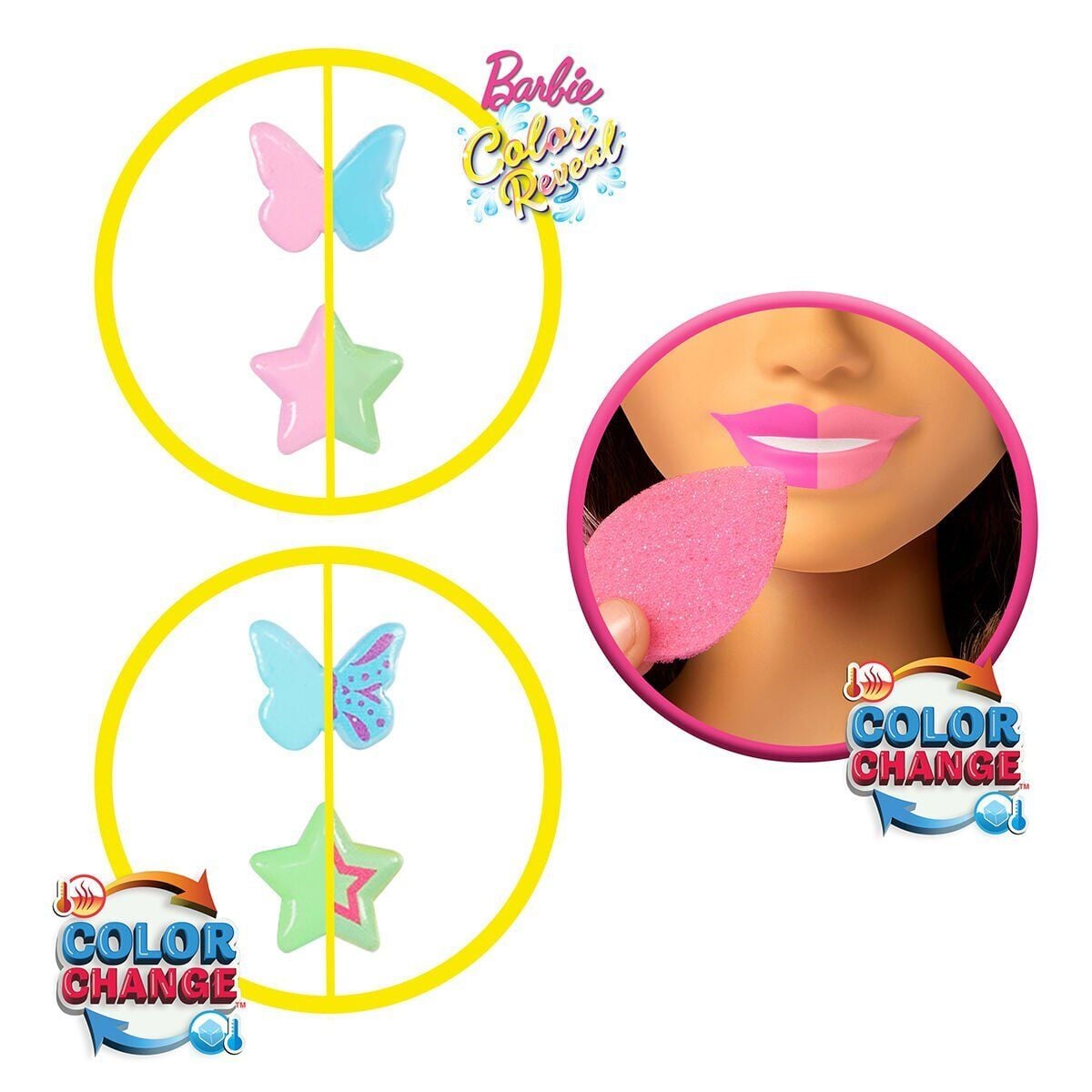 Renk değişimini görmek için Barbie'nin kıskaçlı tokalarını su dolu kaba batırın. Barbie'nin dudakları da renk değiştirebilir. Süngeri suyla ıslatmanız yeterlidir.