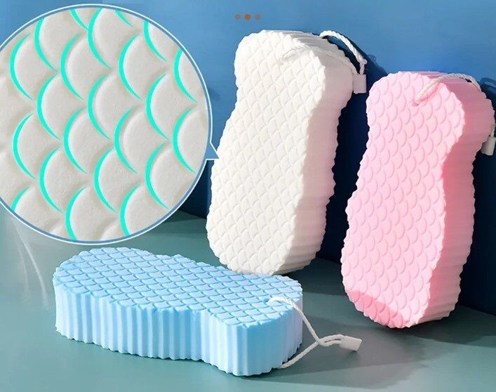 Bu banyo süngeri, süngerler ve cilt arasındaki sürtünmeyi artıran ve çamur sürtünmesini daha iyi hale getiren hassas taneciklere sahiptir.