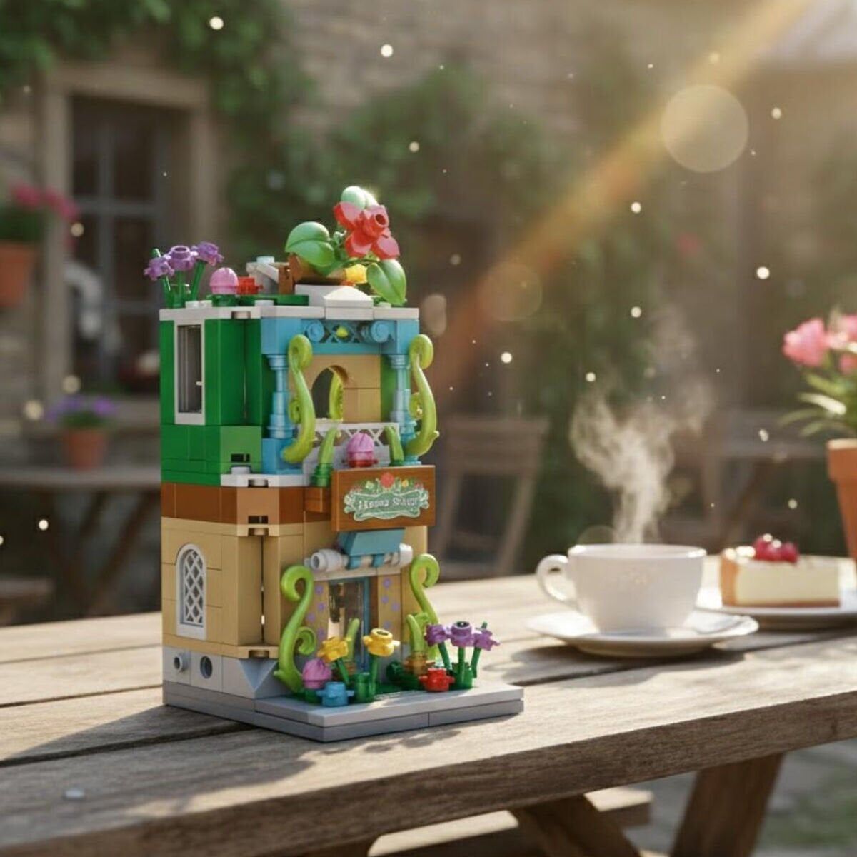 Renkli çiçek rafları, dekoratif aksesuarlar ve dükkân konsepti sayesinde hem oyun hem de sergileme amaçlı kullanılabilir.